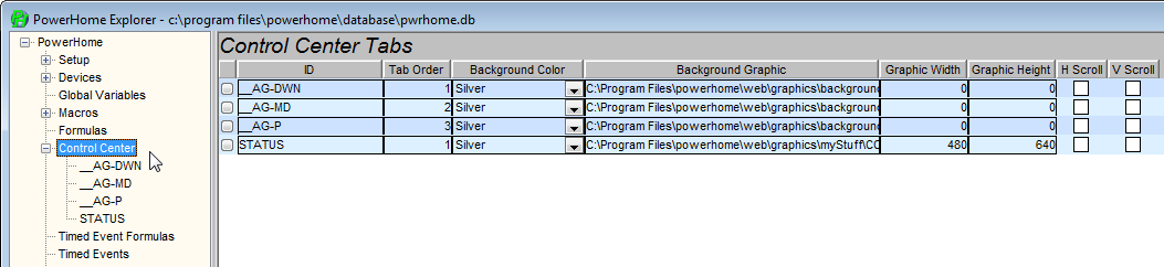 Hopefully this document will help to get you started in constructing your own customized Control Center Panel and enjoying another one of the "priceless" features of PowerHome. Shortly I will also post some guidelines to editing CC Properties in the CC database table found in the PH Explorer>CC Tab. The CC Panel we just defined has a root structure like this. Clicking on one of the Location tabs opens a detail window that reveals all of the properties associated with that CC Tab window. It is daunting (to say the least) to create such a db table from scratch, but starting with the Wizard and then editing a table is reasonably straight forward.